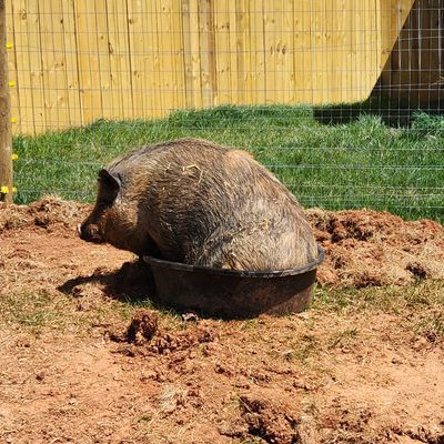 We were looking to add some pigs to the sanctuary and it just so turned out that the Asheville Humane Society had a lot of pigs needing homes. Caroline was drawn to Swinona Ryder because of her outgoing personality (and funny name) and soon they went to meet her. She is a big girl with lots of attitude!!!!!